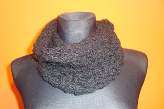 Komin z czegoś lekko włochatego ("bezbanderolowego" - ok. 40 gram, niecały motek) na drutach nr 5. Wzór wzięłam z książki "1000... splotów na drutach i szydełkiem". Rozmiar: 55 cm wysokości i 50 cm obwodu w zależności, jak się toto rozciągnie.